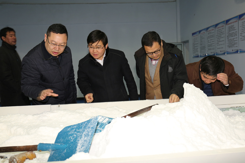 2月7日下午,江蘇省鹽業(yè)集團(tuán)副總經(jīng)理鄭海龍一行在集團(tuán)公司副總經(jīng)理?xiàng)顕?guó)新陪同下到金橋制鹽公司調(diào)研考察。鄭總一行先后參觀了該公司雪花鹽車間、加工鹽車間、包裝鹽車間,對(duì)該公司生產(chǎn)環(huán)境、硬件設(shè)施、車間布局、生產(chǎn)工藝等給予了充分肯定。隨后,雙方圍繞產(chǎn)品結(jié)構(gòu)、價(jià)格調(diào)控、渠道建設(shè)等內(nèi)容展開討論,并就2018年的合作事宜進(jìn)行了洽談。