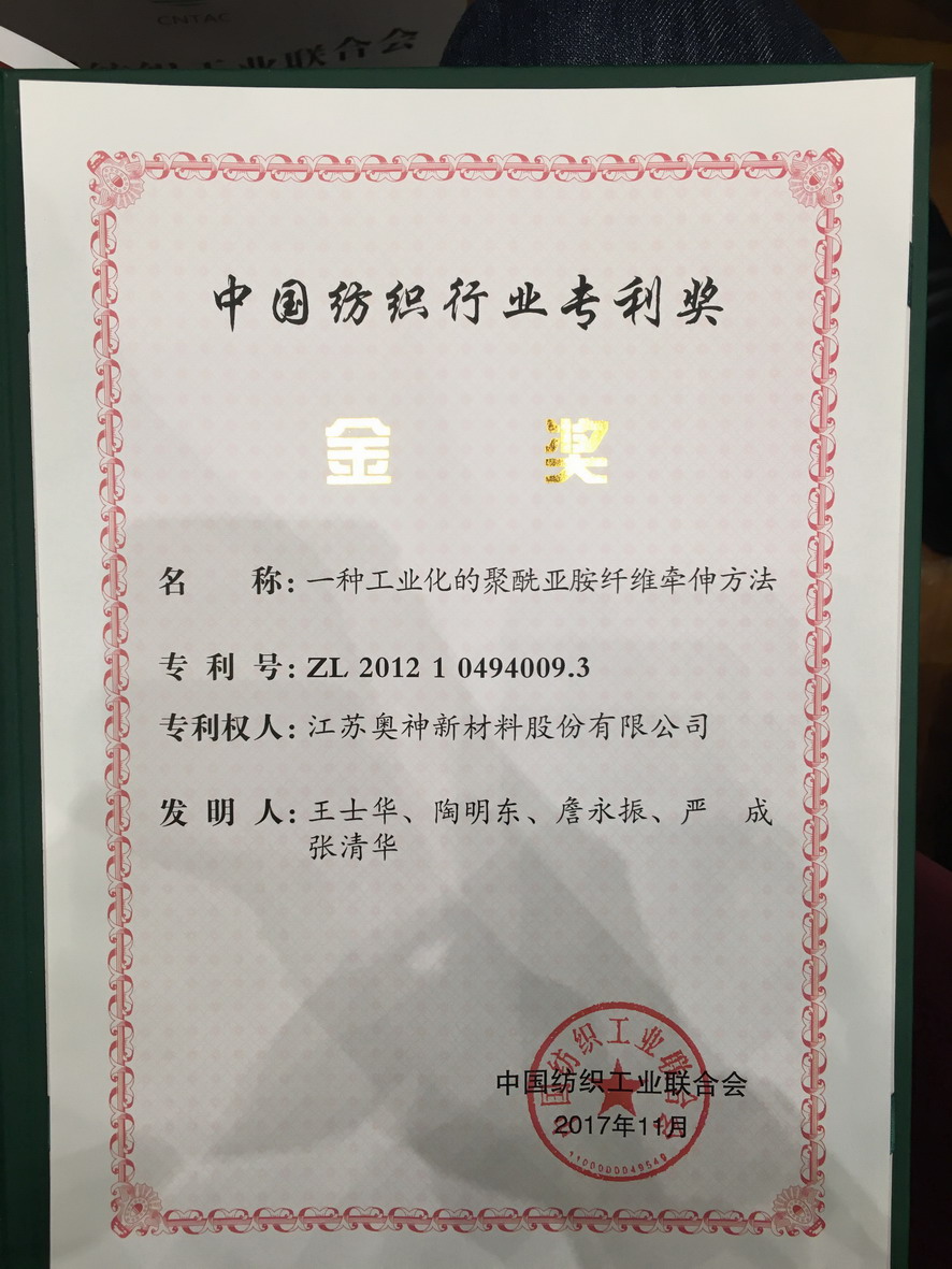 會上發(fā)布了首屆中國紡織行業(yè)專利獎、全國紡織科技創(chuàng)新人才等評審結(jié)果,集團公司副總經(jīng)理王士華獲得“全國紡織科技創(chuàng)新領(lǐng)軍人才”榮譽稱號,并作為獲獎代表上臺發(fā)言。江蘇奧神新材料股份有限公司發(fā)明專利“一種工業(yè)化的聚酰亞胺纖維牽伸方法”獲得首屆中國紡織行業(yè)專利獎金獎。