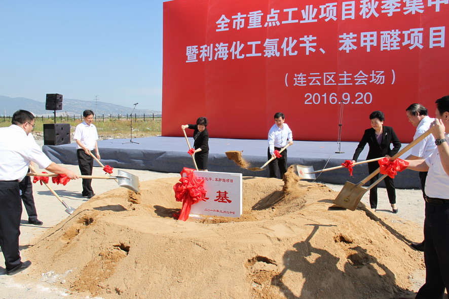 9月20日,我市重點(diǎn)工業(yè)項(xiàng)目秋季集中開工(連云區(qū)主會(huì)場(chǎng))暨利?;ぢ然S、苯甲醛項(xiàng)目奠基儀式在利海公司舉行,市委書記、市人大常委會(huì)主任楊省世,市領(lǐng)導(dǎo)楊莉、董恕娟、徐家保、魯林,集團(tuán)公司董事長(zhǎng)、黨委書記楊龍、總經(jīng)理胡建明等出席開工儀式。