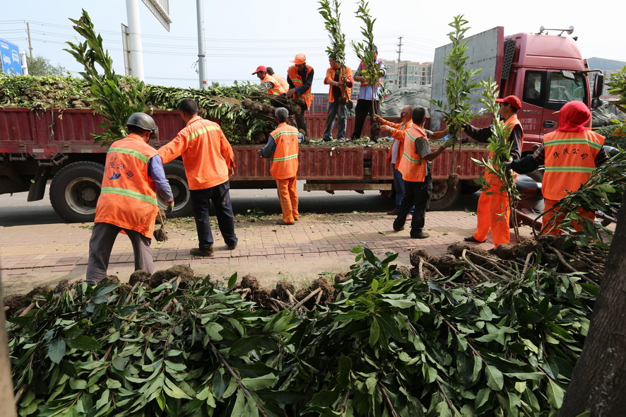 新光路鐵路橋至港城大道段南側綠化帶,因為人為踩踏、車輛碾壓導致綠化斑禿損壞嚴重,為盡快恢復綠化原貌,改善市容市貌。8月18日,裕升、裕欣養(yǎng)護公司組織80多名綠化工,從早上6點一直干到下午6點,卸苗、運苗、挖坑、插苗,烈日酷暑下奮戰(zhàn)一整天,中午在樹陰下吃點盒飯,喝點礦泉水,繼續(xù)工作,橘黃色工作被汗水浸透、被烈日烤干,這樣有好幾個來回?!敖裉煳覀円谶@片綠化補植紅葉石楠、金森女貞等模紋小苗1萬余株,紅葉石楠球等灌木110株,有效改善該路段綠化植被,提升城市形象,我們還要在黃海續(xù)道補植草坪近30000平方,在這條1000多米長的路段,有車輛維修點50多家,車輛出入,對路邊綠化帶傷害非常大,這一路段也是環(huán)衛(wèi)整治長期存在的‘老大難’,這次,在開發(fā)區(qū)行政執(zhí)法部門的配合下,我們要重新種植草坪,對這一‘老大難’路段植被進行恢復,另外德蘭南路、東路補植苗木近80萬元的綠化工程也已開工上土整土,接著要栽苗,根據(jù)開發(fā)區(qū)創(chuàng)衛(wèi)部署要求,上述這些事情必須在8月底完成,所以說時間相當緊,職工們都冒著高溫,加班加點搶進度。”公司副總經理郁宏峰說。
