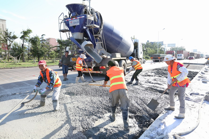 在大港路“新光路至零公里”路段,筆者在水泥路上看到一塊塊被切割成方方正正的凹面,四周都架好防護欄等安全防護設施,在華東城北門偏東不遠處,一臺挖掘機的鏟斗被換上沖擊破碎錘,正在一大塊破損的水泥路面沖擊破碎作業(yè),“嗒嗒嗒”的沖擊聲十分震耳。在與現(xiàn)場作業(yè)的盛達市政公司市政維修項目部副主任史如勤交流中得知,該路段是附近集團箱基站進出港口集裝箱車輛的重要通道,每天有好幾百輛集裝箱車輛進出,水泥路面不堪重負,損壞比較嚴重,根據(jù)開發(fā)區(qū)創(chuàng)衛(wèi)工作要求,由他們對該路段破損處進行局面分割維修,整個路段維修面積達到5000多平方,為保證道路使用通行,采取半幅維修、邊破碎邊澆灌的方式,保證施工進度,現(xiàn)正在維修北側路面,整個路面維修計劃在8月底完成。“因為創(chuàng)衛(wèi),我們下一步還要對轄區(qū)內的破損、歪到的路牙石進行維修扶正,242路段瀝青破損路面維護,還要開通四處道口,而現(xiàn)在事多人少,人手比較緊張,我們周六周日都沒有休息,就是想把創(chuàng)衛(wèi)工作任務一項一項地及時完成,決不能拖創(chuàng)衛(wèi)工作后腿?!彼呎f邊用肩上的毛巾擦著額頭上的汗水。