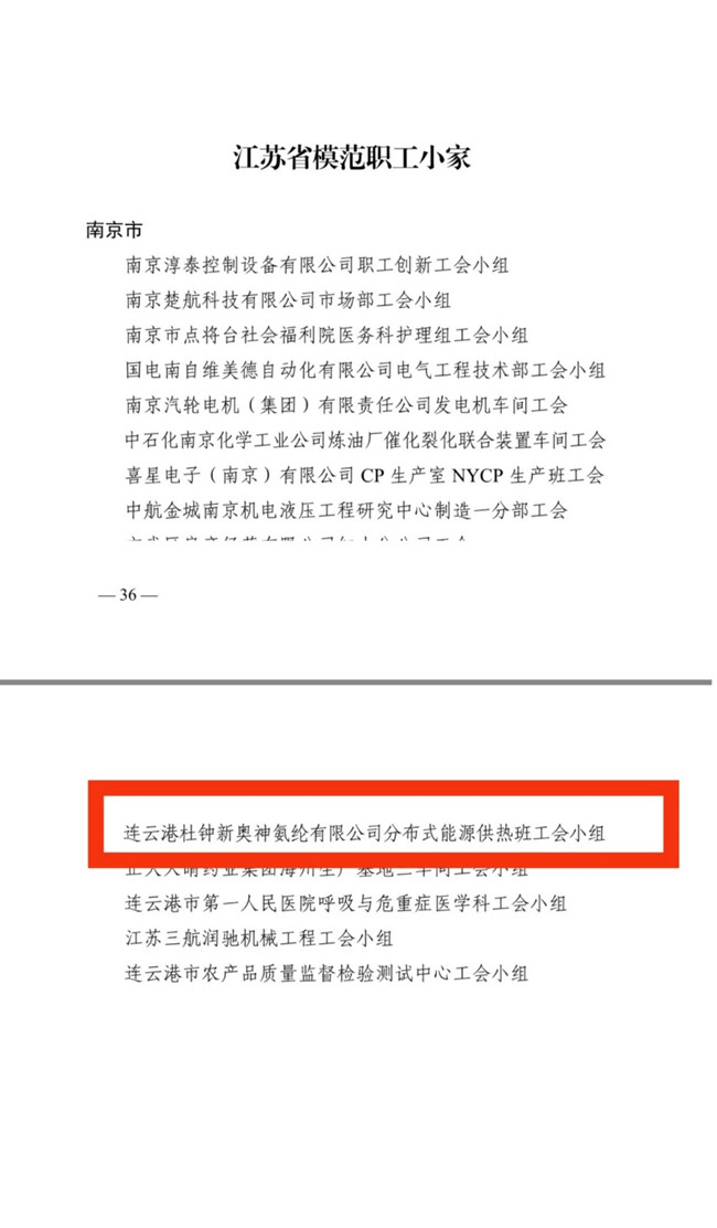 日前,杜鐘氨綸公司分布式能源供熱班工會小組榮獲江蘇省“模范職工小家”稱號。