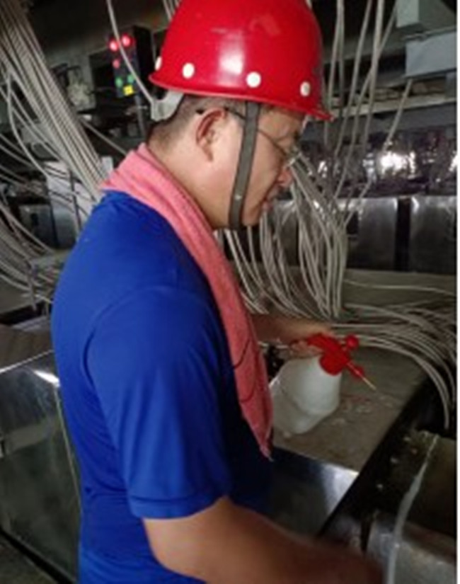 連日高溫悶熱天氣,幾乎讓人失去對(duì)溫度的判斷力。組件平臺(tái)的溫度每日高達(dá)50多度,員工站著不動(dòng)都會(huì)不停出汗,更別提在平臺(tái)上進(jìn)行操作了,每天幾乎都要濕幾遍衣服。