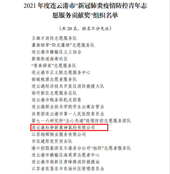 近日,共青團(tuán)連云港市委員會(huì)公布2021年度全市青年志愿者行動(dòng)暨新冠肺炎疫情防控青年志愿服務(wù)貢獻(xiàn)獎(jiǎng)評選表彰結(jié)果,連云港杜鐘新奧神氨綸有限公司志愿者服務(wù)隊(duì)榜上有名,榮獲2021年度連云港市“新冠肺炎疫情防控青年志愿服務(wù)貢獻(xiàn)獎(jiǎng)”組織榮譽(yù)稱號。