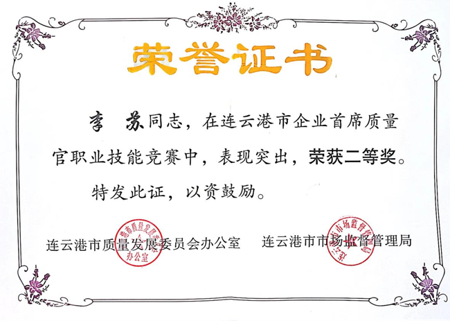 為貫徹落實省委政府《江蘇省質(zhì)量提升行動實施方案》精神,進(jìn)一步推動連云港市企業(yè)高質(zhì)量發(fā)展,市質(zhì)量發(fā)展委員會辦公室和市市場監(jiān)督局聯(lián)合與6月份舉辦了2022年連云港市企業(yè)首席質(zhì)量官職業(yè)技能競賽。氨綸公司代表李蘇同志發(fā)揚(yáng)勇于拼搏、不驕不躁的競賽精神,獲得了此次競賽二等獎。