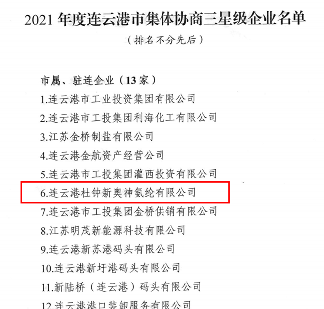 日前,從市協(xié)調(diào)勞動(dòng)關(guān)系三方委員會(huì)辦公室傳來喜訊,2021年度連云港市集體協(xié)商三星級企業(yè)評定結(jié)果新鮮出爐,杜鐘氨綸公司獲評市級“集體協(xié)商三星級企業(yè)”。