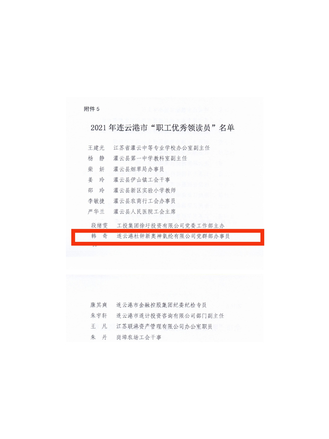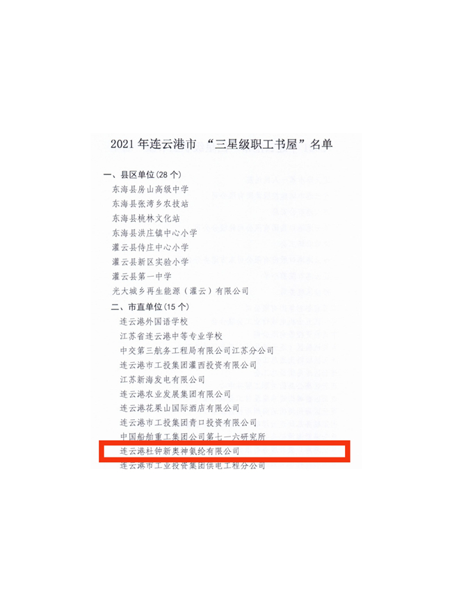 日前,連云港市總工會(huì)下發(fā)的《關(guān)于2021年連云港市“星級(jí)職工書(shū)屋”、職工優(yōu)秀領(lǐng)讀員情況通報(bào)》,杜鐘氨綸公司獲評(píng)2021年度連云港市“三星級(jí)職工書(shū)屋”、韓奇獲評(píng)2021年連云港市“職工優(yōu)秀領(lǐng)讀員”,標(biāo)志著公司職工書(shū)屋建設(shè)再上新臺(tái)階。