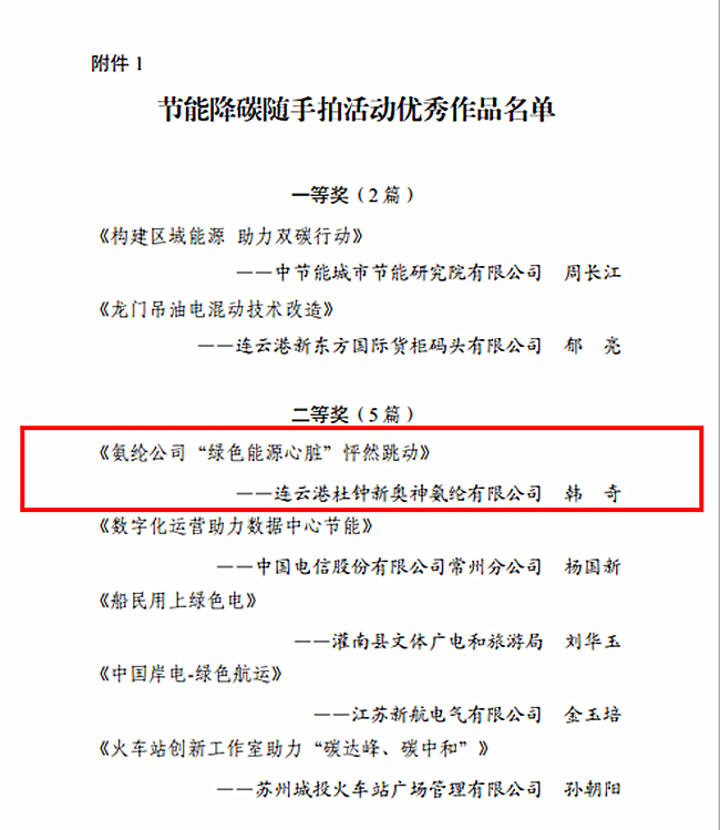 日前,江蘇省總工會(huì)在全省職工中開展節(jié)能降碳隨手拍活動(dòng)評(píng)選結(jié)果正式公布,杜鐘氨綸公司《氨綸公司“綠色能源心臟”怦然跳動(dòng)》榮獲二等獎(jiǎng)。黨群工作部 韓奇