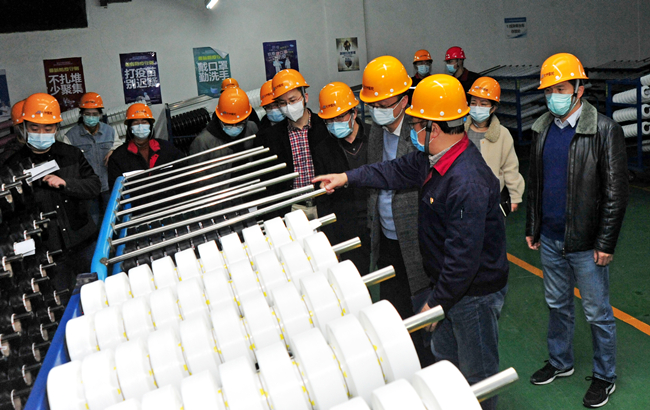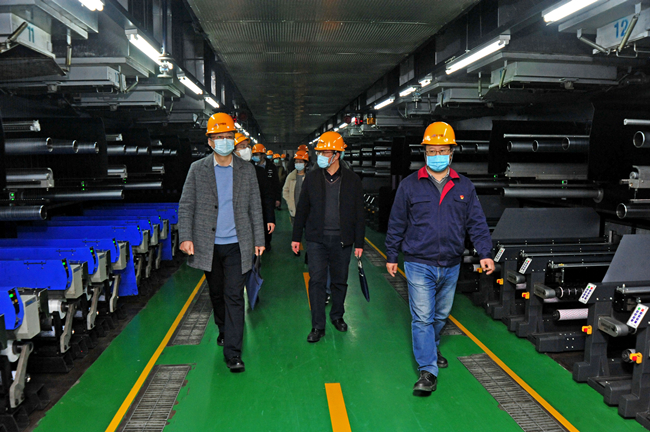 安處長一行參觀了展廳、八期生產(chǎn)線、自動包裝線。在隨后的交流座談會上,張斌總經(jīng)理詳細地介紹了杜鐘氨綸的發(fā)展歷程及近年來的生產(chǎn)運營情況。胡傳法書記具體匯報了氨綸黨建工作的開展情況,著重介紹了三組聯(lián)建的實施背景、重要意義、取得成效。工信局調(diào)研組向我司宣講了有關(guān)政策,并對我司的數(shù)字化項目提出建議。