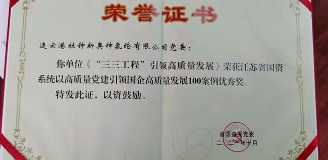 日前,杜鐘氨綸公司《“三三工程”引領(lǐng)高質(zhì)發(fā)展》榮獲江蘇省國資系統(tǒng)以高質(zhì)量黨建引領(lǐng)國企高質(zhì)量發(fā)展100案例優(yōu)秀獎(jiǎng)。