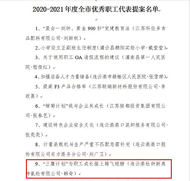 日前,市總工會(huì)開展全市優(yōu)秀職工代表提案征集推薦活動(dòng)評(píng)選結(jié)果正式公布,杜鐘氨綸公司《“三鷹計(jì)劃”為職工成長插上騰飛翅膀》榮獲全市優(yōu)秀職工代表提案。