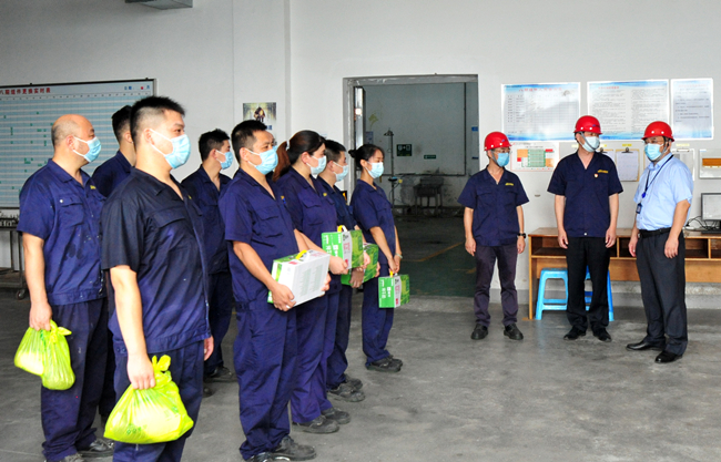進(jìn)入盛夏以來(lái)持續(xù)高溫,為向堅(jiān)守崗位的一線職工表達(dá)敬意和關(guān)懷。8月2日上午,集團(tuán)黨委書(shū)記、董事長(zhǎng)楊龍一行人來(lái)我公司慰問(wèn)高溫工作環(huán)境下的一線員工,公司黨委書(shū)記胡傳法、副總經(jīng)理張華衛(wèi)陪同。