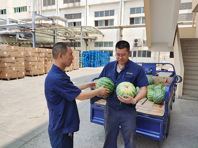 送清涼。入夏以來(lái),我市持續(xù)高溫,公司工會(huì)牽頭辦公室向一線員工送防暑降溫用品,在炎炎夏日為一線員工送去飲料、礦泉水等飲品和工會(huì)“娘家人”的問(wèn)候。食堂每日為員工提供綠豆湯、西瓜等夏季瓜果,讓一線工人們?cè)诳崾钪懈惺艿搅艘唤z舒心的涼意。為了防止高溫季節(jié)突發(fā)意外,公司安全部購(gòu)買藿香正氣水、人丹、風(fēng)油精等應(yīng)急藥品發(fā)放到各生產(chǎn)部門,為員工平安度夏做好預(yù)防工作,切實(shí)保障他們的身體健康。