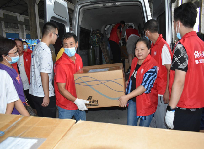 中午十二點,第一批物資捐贈后,顧不得吃飯我們就奔赴第二個捐贈點滎陽紅十字會。路上交警為我們耐心引導(dǎo),仔細說明哪里有塌方,哪里可以通行,臨行還貼心的留下微信號碼,囑咐道:在鄭州遇到困難隨時聯(lián)系。到達后不出意外的開始排隊,看著其他志愿者熱火朝天的忙碌,我和同行的小孫心里很不是滋味:我們千里迢迢帶著集團公司黨委和公司黨委的重托和港城人民的美好祝愿來到災(zāi)區(qū),我們不僅僅是要來捐贈物資,是不是也該做點什么?幾經(jīng)請示,紅會組織人員終于答應(yīng)了我們的請求,同意我們作為臨時志愿者加入搬運捐贈物資的隊伍。雖然大家已經(jīng)兩天沒合眼了,但是當穿上志愿者馬甲后,我們頓時精神煥發(fā),立刻投入到緊張有序的搬運工作中。托舉起每一件來自祖國各地捐贈物資,心里都暖暖的,因為這里充滿了來自大江南北人們深深的祝福,激動的心情難以言表。此刻,我們對“眾志成城”有了更深刻的理解。