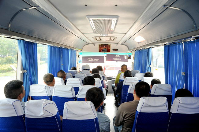運(yùn)轉(zhuǎn)班員工在通勤車上觀看慶祝大會(huì)。