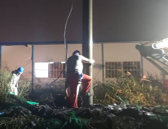 今年的10月天氣還是熱的厲害,電桿被太陽曬的滾燙,搶修人員臉上掛滿了豆大的汗珠,工作服已經(jīng)全部濕透。為了搶時間,抓進度,作業(yè)人員們?nèi)徊活?,依然緊張有序地工作著。現(xiàn)場搶修工作涉及吊車、挖掘機等大型施工機具,安全管控尤為重要,現(xiàn)場所有搶修人員在工作負責人的指揮下平穩(wěn)有序的推進搶修工作,吊車擺放位置、挖掘機挖桿洞的位置等每一個關(guān)鍵工作點都在搶修人員的嚴格監(jiān)督下進行,不敢有絲毫松懈。就在這時,天公不作美,突然下起了大雨,可是大雨并沒有攔住搶修工作。臺北供電所現(xiàn)場所有的搶修人員在錢所長的帶領(lǐng)下,穿著濕透的工作服在雨中指揮挖掘機開挖桿洞、組立電桿、連接導線-------搶修人員在天昏地暗的雨中穿梭,雨水和汗水交匯在電力搶修人員的臉龐上,大家都來不急擦拭一下臉上的雨水,在雨中忙碌著。經(jīng)過4個半小時的緊張有序搶修,晚上19:30分10KV港北線恢復供電。