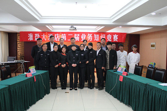 為了進(jìn)一步提高酒店全體員工安全生產(chǎn)意識(shí)以及酒店專(zhuān)業(yè)業(yè)務(wù)水平,淮鹽大酒店于11月19日舉行第二屆“酒店綜合知識(shí)競(jìng)賽”,酒店總經(jīng)理伏運(yùn)余、副總經(jīng)理?xiàng)罘?、質(zhì)檢經(jīng)理周洪近、餐飲經(jīng)理郭天麗擔(dān)任裁判,現(xiàn)場(chǎng)氣氛非常活躍,競(jìng)賽取得圓滿成功。