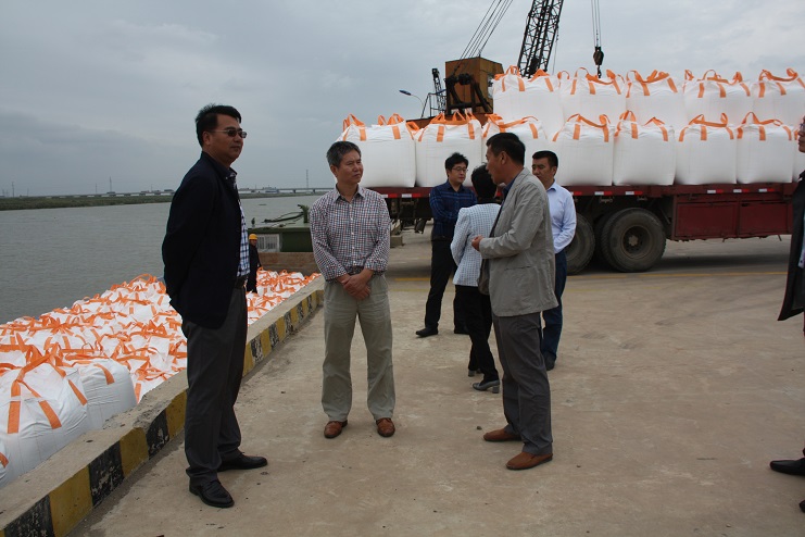在五灌河碼頭現(xiàn)場(chǎng),宵洋物流公司工人正忙于裝卸作業(yè),將車輛上化工產(chǎn)品噸袋物資吊裝下船艙,喻振東副局長(zhǎng)一行首先到碼頭現(xiàn)場(chǎng)視察碼頭的生產(chǎn)建設(shè)情況,隨后到投資公司三樓會(huì)議室進(jìn)行了座談。