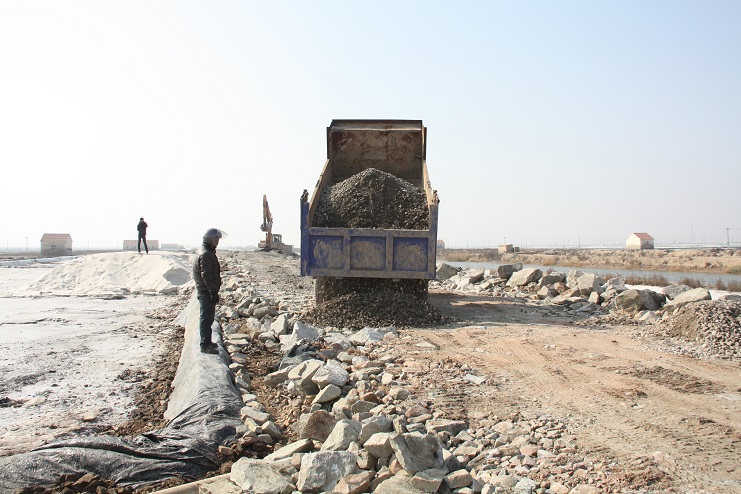 2月15日,在新河制鹽公司七至十班運(yùn)鹽路施工現(xiàn)場(chǎng),我們看到南翼公司項(xiàng)目工程分公司的員工正在指揮兩臺(tái)小型工程車(chē)將石子傾倒在路基上,兩臺(tái)挖掘機(jī)正忙于將運(yùn)送來(lái)的石子整平。運(yùn)鹽河對(duì)面,三輛滿載土夾石的大型工程車(chē)一字排開(kāi),正等待卸載。據(jù)了解,目前正在施工的是新河制鹽分公司二期運(yùn)鹽路維修改造工程,該工程改造路段全長(zhǎng)3300米,計(jì)劃總投資193萬(wàn)元,其中路基鋪設(shè)部分由日曬制鹽公司出資45萬(wàn)元,路面部分則由縣交通局承擔(dān),預(yù)計(jì)需要投入148萬(wàn)元。該工程于去年底開(kāi)始施工,預(yù)計(jì)三月中下旬全部鋪設(shè)完成。另外新河制鹽分公司一期一至十二班3300米運(yùn)鹽路改造工程計(jì)劃將于今年下半年實(shí)施。