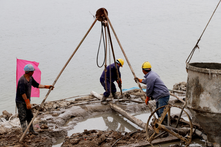 5月30日下午,藍(lán)色的天空沒有一絲云彩,火熱的太陽炙烤著大地。在灌西投資公司五灌河碼頭擴(kuò)建項(xiàng)目建設(shè)工地,施工人員正在各司其職的工作著,有的在使用電鋸,有的在壓鋼筋,還有的在焊接鋼筋框架。遠(yuǎn)處一臺(tái)混凝土澆灌機(jī)在進(jìn)行混凝土澆灌作業(yè),碼頭岸邊大小打樁機(jī)器一字排開,筆者親身感受五灌河碼頭二期工地開發(fā)建設(shè)的火熱場(chǎng)面。