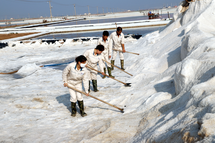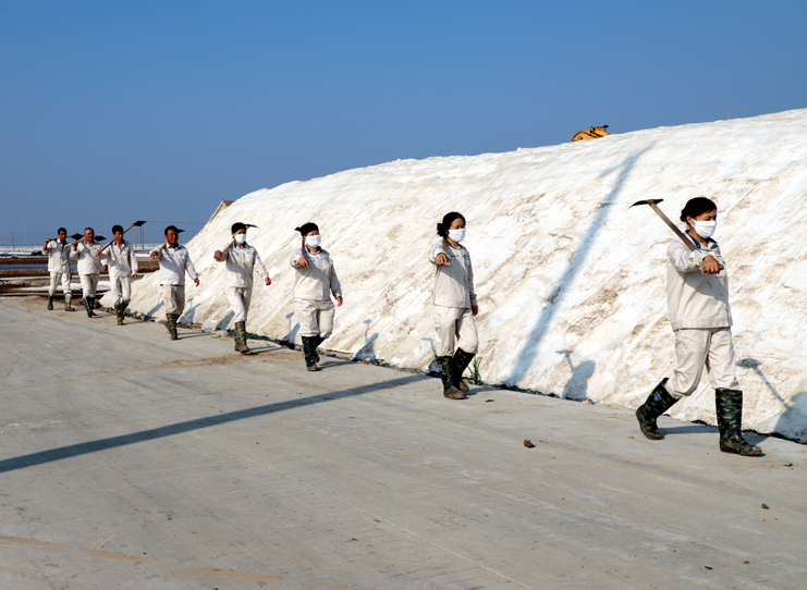 趁著休息的間隙,筆者與身邊忙得滿頭大汗的8班班長祝星星聊了起來。據(jù)祝星星介紹,每天員工4點半就到灘頭,進行鹽池的人工活碴、稟基修復、鹽池鹵水補充、收放設備檢查等一系列工作,因此,合理安排工作量非常重要。他告訴筆者,室外工作工人的勞保服比較厚,一天下來工作服濕了又干,干了又濕,衣服上都泛出厚厚的鹽漬。一天下來,全班要消耗2大桶甚至更多的飲用水?,F(xiàn)在公司里對我們一線生產(chǎn)崗位員工非常關心,防暑降溫工作非常到位。最近,單位又為我們發(fā)放高溫津貼、電風扇、防暑降溫藥品。這些讓我們員工真切感受到組織的力量,組織得偉大,所以雖說現(xiàn)在比平時更辛苦,我們有信心戰(zhàn)高溫、奪高產(chǎn)。