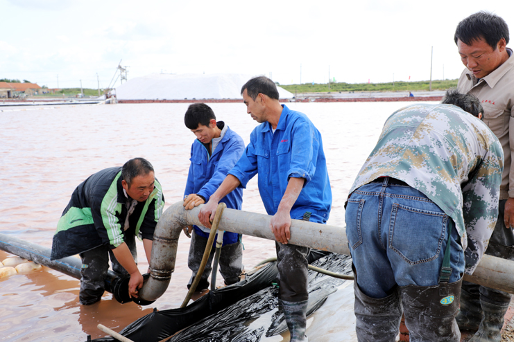 在10班扒鹽現(xiàn)場(chǎng),我們看到扒鹽機(jī)“T30”操作手正在嫻熟的駕駛著機(jī)器在鹽池內(nèi)緩緩移動(dòng),遠(yuǎn)處的鹽廩上,雪白的原鹽正通過(guò)扒鹽篩匯集而下,大廩工也不時(shí)的用分離板進(jìn)行引鹽疏導(dǎo),潔白晶瑩的鹽晶蔚然成廩。據(jù)介紹,在扒鹽設(shè)備上,今年日曬制鹽公司全面推廣使用五寸管道、輕型自吸式電動(dòng)履帶“T30”扒鹽機(jī)、扒鹽機(jī)鹽池循環(huán)路徑,輕型扒鹽機(jī)降低了對(duì)鹽池板的損傷,在扒鹽效率上也有了很大提高,扒鹽機(jī)鹽池循環(huán)路徑也進(jìn)一步降低了工人的勞動(dòng)負(fù)荷。據(jù)了解,目前新河、埒南兩個(gè)制鹽分公司共投入8臺(tái)扒鹽機(jī)組,中秋小長(zhǎng)假以扒鹽2萬(wàn)多噸,預(yù)計(jì)11月上旬結(jié)束。(張明建)