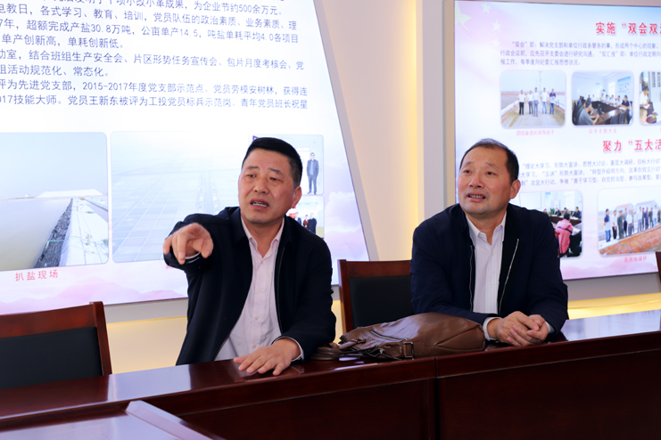 檢查組一行先后到新河制鹽分公司、老機(jī)關(guān)新建黨建室進(jìn)行實(shí)地檢查驗(yàn)收,在新河制鹽分公司黨建活動(dòng)室,江舜軍部長一行詳細(xì)聽取了該黨支部書記李加新對(duì)黨建工作的匯報(bào),隨后,在老機(jī)關(guān)綜合黨員活動(dòng)中心,檢查組一行利用活動(dòng)室電子顯示屏觀看了集團(tuán)司歌視頻。