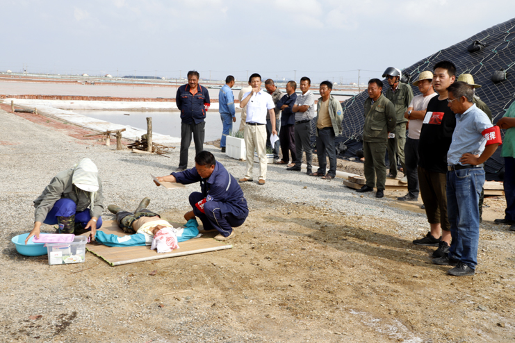 當(dāng)天下午正直高溫天氣,室外環(huán)境悶熱?,F(xiàn)場(chǎng),鹽工孫良成在烈日下工作幾個(gè)小時(shí)后早已汗流浹背,堅(jiān)持工作一段時(shí)間后,感到頭暈?zāi)垦?,支持不住倒在了鹽池邊上?,F(xiàn)場(chǎng)安全員張軍連第一時(shí)間趕到現(xiàn)場(chǎng),根據(jù)經(jīng)驗(yàn),初步判斷倒地者出現(xiàn)了中暑癥狀。立即組織員工董志波和曹軍華將孫良成抬至陰涼通風(fēng)處,側(cè)臥后仰頭部,保持其呼吸暢通。并解開他身上的衣扣,一邊為他扇風(fēng)送涼。大伙一邊用溫濕毛巾不斷為他擦拭身體降溫,一邊喂他服下藿香正氣水,并用清涼油、風(fēng)油精等擦拭額頭位置。在現(xiàn)場(chǎng)急救迅速開展的同時(shí),班長林樹軍立即向埒南分公司安全負(fù)責(zé)人江躍匯報(bào),江躍到達(dá)現(xiàn)場(chǎng)了解情況并通知公司經(jīng)理?xiàng)钍乇?,同時(shí)通知120急救中心,幾分鐘后,120急救人員趕到現(xiàn)場(chǎng),并對(duì)中暑人員進(jìn)行施救,經(jīng)過緊張有序的急救,患者逐漸蘇醒并初步恢復(fù)神智,抬上救護(hù)車送去醫(yī)院,至此演練結(jié)束。