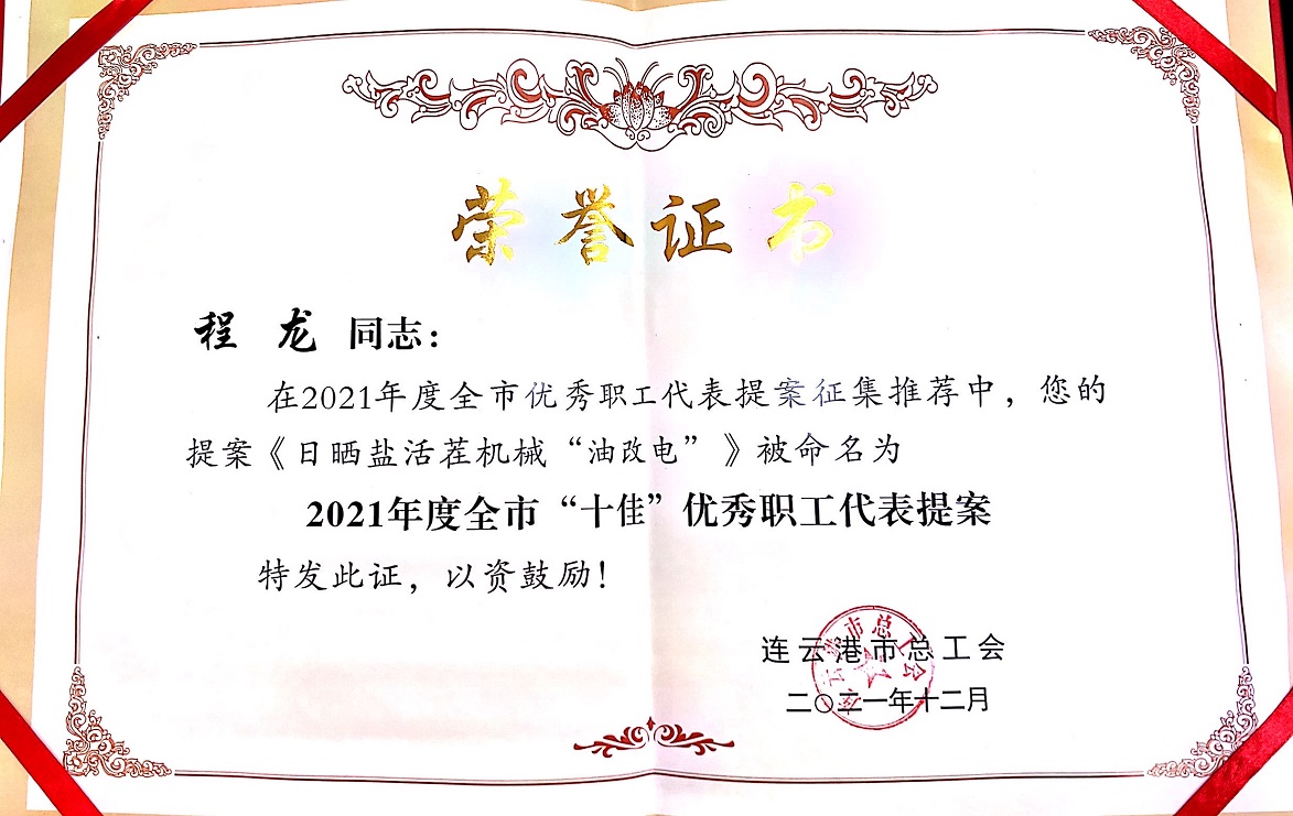 程龍的《日曬鹽活茬機(jī)械“油改電”》被命名為2021年度全市十佳優(yōu)秀職工代表提案。(楊婕)