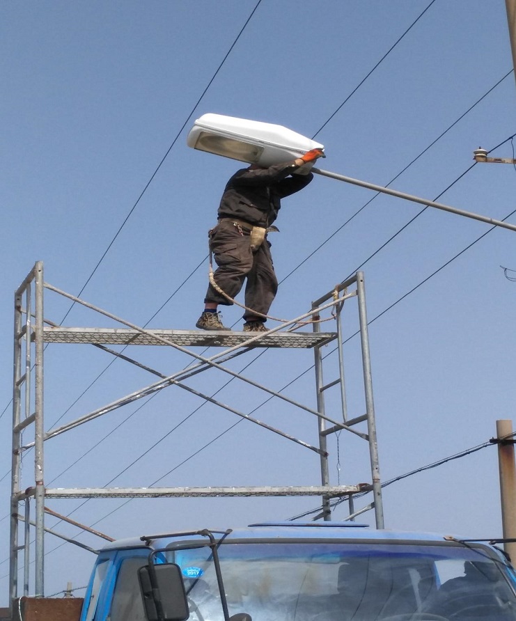 為保證日曬鹽公司職工夜間上班安全,機(jī)電服務(wù)公司接到任務(wù)后,及時(shí)組織技術(shù)人員對(duì)道路路燈進(jìn)行檢查,確定修理方案, 該公司職工能放棄休息日,進(jìn)行搶修。共更換引線10盞,換燈泡20只。(圖為5月7上午開始修理現(xiàn)場)