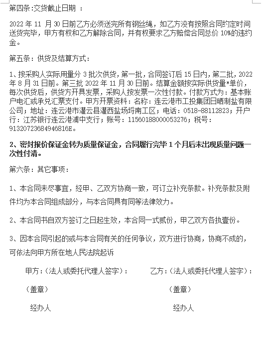 連云港市工投集團日曬制鹽有限公司鋼絲繩采購項目