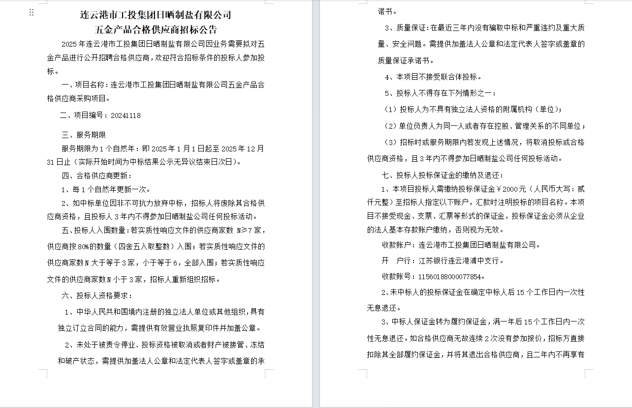 連云港市工投集團日曬制鹽有限公司五金產(chǎn)品合格供應(yīng)商招標(biāo)公告