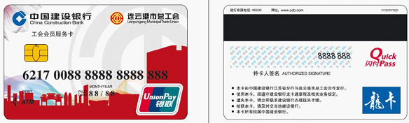 工會(huì)會(huì)員服務(wù)卡是一張集工會(huì)會(huì)員身份識(shí)別功能、會(huì)員服務(wù)功能于一體的工會(huì)會(huì)員實(shí)名服務(wù)卡。具體功能如下: (一)身份識(shí)別功能。工會(huì)會(huì)員服務(wù)卡具有工會(huì)會(huì)員身份識(shí)別功能,記載工會(huì)會(huì)員基本信息,全市工會(huì)會(huì)員實(shí)名制動(dòng)態(tài)管理。 (二)工會(huì)服務(wù)功能。工會(huì)會(huì)員服務(wù)卡具有劃入存貯工會(huì)所有幫扶救助資金的服務(wù)功能,持卡會(huì)員還可免費(fèi)或優(yōu)惠享受工會(huì)組織提供的困難幫扶、職業(yè)介紹、技能培訓(xùn)、心理咨詢(xún)、勞動(dòng)爭(zhēng)議調(diào)解等服務(wù)。 (三)金融服務(wù)功能。工會(huì)會(huì)員服務(wù)卡具有銀行借記卡的所有功能。 (四)社會(huì)服務(wù)功能。工會(huì)會(huì)員服務(wù)卡整合部分社會(huì)服務(wù)功能,通過(guò)工會(huì)與加盟機(jī)構(gòu)合作,為持卡會(huì)員提供醫(yī)療保健、文化娛樂(lè)、商業(yè)購(gòu)物、生活服務(wù)等領(lǐng)域的優(yōu)惠服務(wù)。(具體簽約單位見(jiàn)市總工會(huì)網(wǎng)站www.lygzgh.org/ka/) 下圖為工會(huì)會(huì)員服務(wù)卡卡樣,連云港市總工會(huì)發(fā)行的工會(huì)會(huì)員服務(wù)卡只此一種設(shè)計(jì),請(qǐng)認(rèn)準(zhǔn)連云港市總工會(huì)logo和工會(huì)會(huì)員服務(wù)卡字樣,若同此圖不同均非工會(huì)會(huì)員服務(wù)卡。