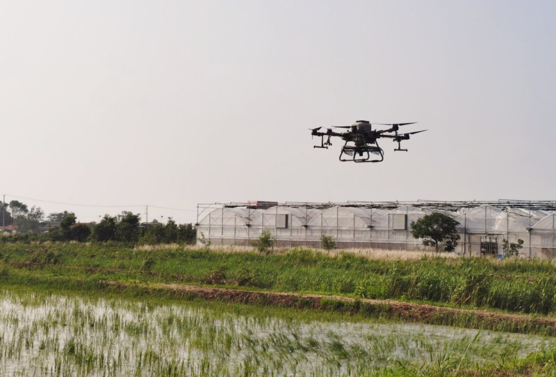 夏至水門開,接連幾天的暴風雨,田間道路泥濘。6月28日下午,天氣剛剛轉(zhuǎn)晴,倉儲中心抓住有利天時,緊爭農(nóng)務,搶抓農(nóng)時節(jié)點,采用無人機為水稻田有序開展追肥工作。(姜姝妍)