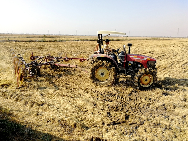 為有效防止秸稈焚燒形成的污染,保護(hù)生態(tài)環(huán)境,促進(jìn)秸稈綜合利用。日前,大新農(nóng)場(chǎng)在水稻收割的同時(shí)積極聯(lián)系秸稈回收廠家,對(duì)水稻秸稈進(jìn)行回收打包。稻田里,帶有八個(gè)圓形大齒輪的水稻摟草機(jī)正在工作,機(jī)器行駛在收割完的稻田中,將聚攏后的秸稈進(jìn)行打捆作業(yè),所過之處水稻秸稈被卷起,變成從機(jī)械后面“吐”出的一個(gè)個(gè)圓形稻草捆。通過秸稈回收,將大大降低秸稈焚燒安全隱患和環(huán)境污染問題。 (大新農(nóng)場(chǎng))