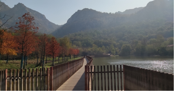 斗轉(zhuǎn)星移,山河已變,五百年前詩(shī)人所描述的風(fēng)景我們無(wú)法再欣賞到,但是現(xiàn)在的園林水庫(kù)更有一番風(fēng)采?;鸺t的水杉是她最引人注目的特色之一,寒風(fēng)掠過(guò),水杉的葉子也逐漸變成了鮮艷的火紅色,猶如一片片燃燒的火焰,在寒冷的季節(jié)中增添了一抹暖色。徜徉于火紅的水杉林,陽(yáng)光下樹(shù)影婆娑,寧?kù)o,安逸,沉醉于詩(shī)畫中。波光粼粼的湖水更是一幅美妙的畫卷,清澈透明,水草搖曳,微波蕩漾,游魚穿梭,仿佛寒冷與它們無(wú)關(guān)。棧橋嫻熟地穿越著園林與水庫(kù),一直連接到山腳,行走其上,腳下水光瀲滟,眼前層林盡染,晴空之下無(wú)一絲塵埃,啾啾鳥鳴,沙沙葉響,嘩嘩水流,大自然的樂(lè)章歡快靜謐。