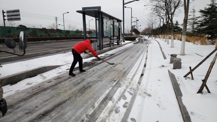 “融雪劑拋灑的時候要均勻拋灑,不要成團(tuán)堆積,這樣不僅融雪的效果不好,還會浪費物資?!鳖A(yù)備黨員武新忠一邊說著,一邊示范著給其他隊員。哪里的積雪最厚,哪里就有他們揮鍬鏟雪的身影。在融雪劑不能及時送達(dá)的情況下,他們就使用人工除雪的方式,不斷檔、不離線、不缺位的清除路面積雪,保證路面不出現(xiàn)積雪狀況。為堅決完成上級“雪停路凈”的掃雪除冰任務(wù),他們不畏嚴(yán)寒,冒著風(fēng)雨冰雪,晝夜不停,連續(xù)三天奮戰(zhàn)在掃雪的一線!以雪為令,雪不停,掃雪不止,一直堅守在掃雪工作中,有效清除了區(qū)域內(nèi)的積雪,確保了交通道路的安全暢行。