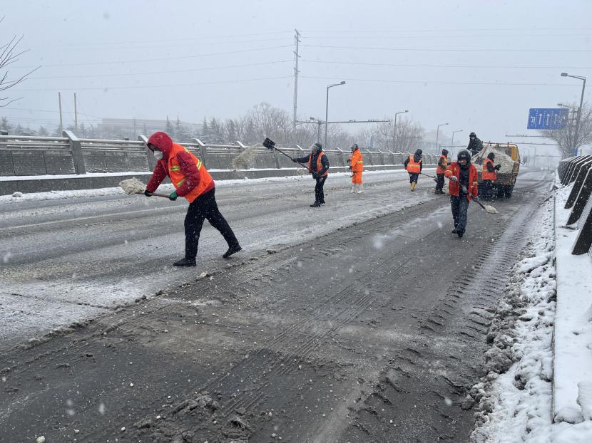 自2月2日以來,裕升養(yǎng)護(hù)分公司接到掃雪除冰緊急通知后積極響應(yīng),迅速調(diào)配人員和物資,等待暴雪降臨。在負(fù)責(zé)人霍正鋼的帶領(lǐng)下,公司第一時間成立應(yīng)急搶險隊,這是一支由12名隊員,平均年齡在57歲所組成的隊伍,更是一支“特別能吃苦、特別能奉獻(xiàn)、特別能擔(dān)當(dāng)”的隊伍。雪花于晚次日11點飄然而至,霍正鋼密切關(guān)注雪量以及積雪狀況,并做好指揮部署,同時通知各隊員立即開展道路掃雪除冰工作。