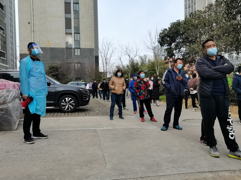 李明:“請大家站好,保持一米線的距離,很快就排到了,不要急躁。”