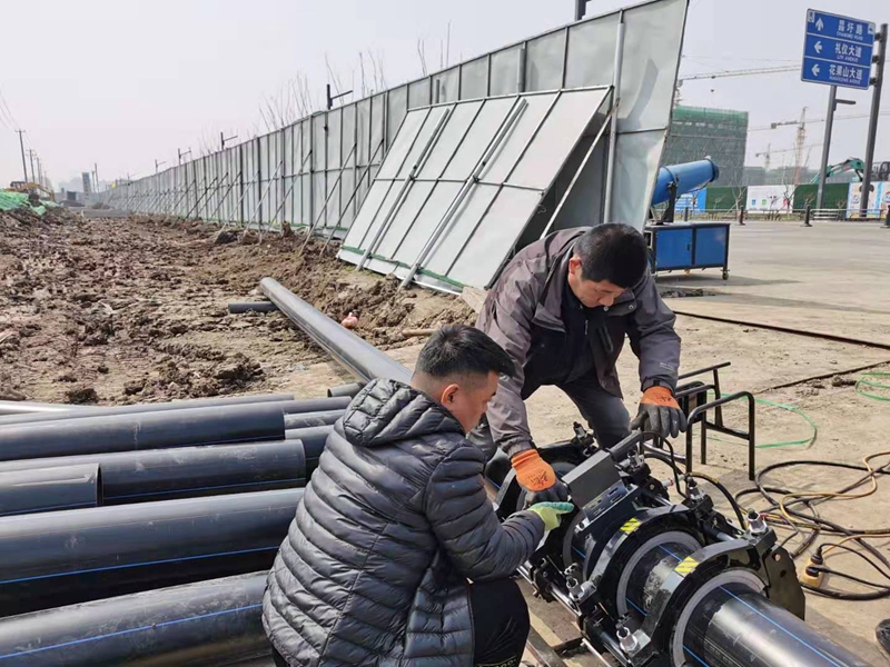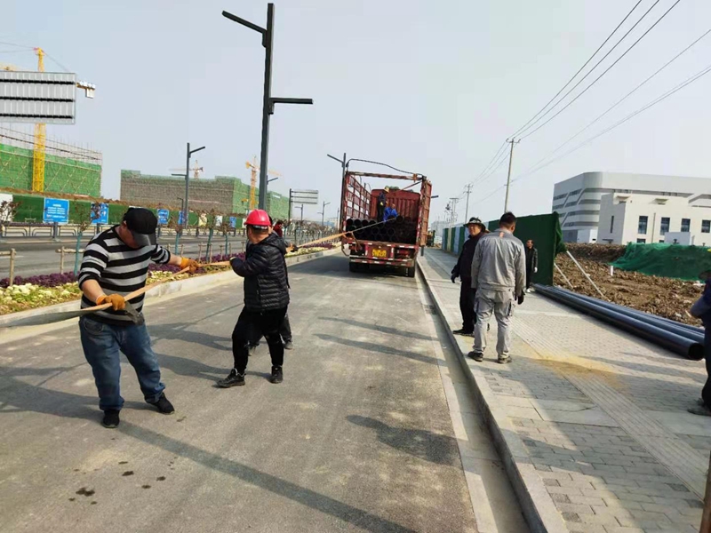 3月14日清晨,在金橋路管道施工現(xiàn)場,早已是人頭攢動、號子聲響,隨著一根根9米長的PE250管道被有條不紊的卸下車,金橋路鈣液管道遷建工程順利拉開序幕。