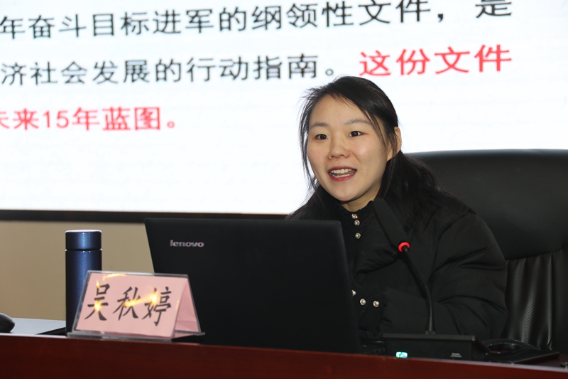 吳秋婷副主任在題為“開啟全面建設(shè)社會(huì)主義現(xiàn)代化國(guó)家新征程”報(bào)告中,從新階段與新目標(biāo)、新理念與新部署、新變化與新格局等三個(gè)方面給大家解讀了黨的十九屆五中全會(huì)精神。“新階段與新目標(biāo)”部分,介紹了我國(guó)在決勝全面建成小康社會(huì)取得的三大決定性成就,即十三五期間,全面深化改革取得重大突破;經(jīng)濟(jì)實(shí)力、科技實(shí)力、綜合國(guó)力躍上新的大臺(tái)階。在“新理念與新部署”部分,從社會(huì)發(fā)展、創(chuàng)新發(fā)展、統(tǒng)籌發(fā)展等角度分別提出了習(xí)近平總書記在新時(shí)代下對(duì)中國(guó)共產(chǎn)黨人的要求以及我國(guó)社會(huì)發(fā)展必須遵循的基本原則。在“新變化與新格局“部分,強(qiáng)調(diào)實(shí)現(xiàn)“十四五”規(guī)劃和2035年遠(yuǎn)景目標(biāo)意義重大、任務(wù)艱巨,但是前景光明,全黨全國(guó)各族人民要緊密團(tuán)結(jié)在以習(xí)近平同志為核心的黨中央周圍,同心同德,頑強(qiáng)奮斗,積極響應(yīng)十九屆五中全會(huì)對(duì)全黨全國(guó)人民的號(hào)召,奪取全面建設(shè)社會(huì)主義現(xiàn)代化國(guó)家的勝利。