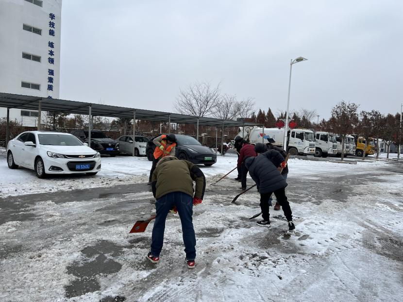 在清理工作現(xiàn)場,該公司負(fù)責(zé)人趙陽帶領(lǐng)黨員干部攜帶各種除雪工具,先后來到各自的責(zé)任區(qū)開始清除積雪,有的奮力潑灑融雪劑;有的拿著大板鍬,推著積雪露出一道道干凈的路面;有的在寒風(fēng)中不停地?fù)]舞著手中的鐵锨,使勁清理著被汽車壓結(jié)實的冰渣;有的將積雪一點點地集中到一起,然后用掃帚掃凈路面,大家你鏟我掃,團(tuán)結(jié)協(xié)作,干勁十足,一片熱火朝天的除雪景象。