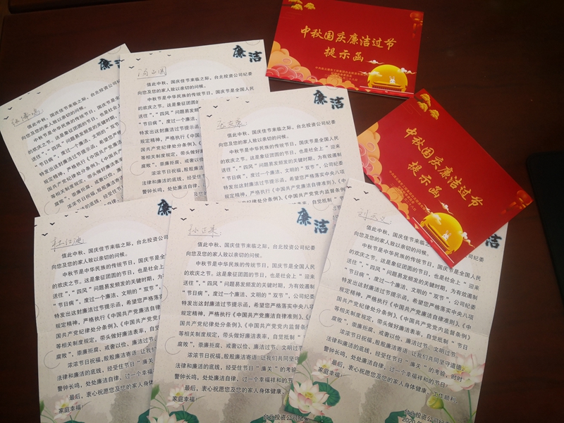 中秋、國(guó)慶將至,為更嚴(yán)更細(xì)落實(shí)中央八項(xiàng)規(guī)定精神,防止“四風(fēng)”反彈回潮,臺(tái)北投資公司紀(jì)委緊盯關(guān)鍵節(jié)點(diǎn),及時(shí)開展節(jié)前廉潔提醒工作,向單位主要負(fù)責(zé)人、重點(diǎn)崗位人員贈(zèng)送廉潔過節(jié)提示函,著力營(yíng)造風(fēng)清氣正、歡樂祥和的節(jié)日氛圍。(孫小玲)