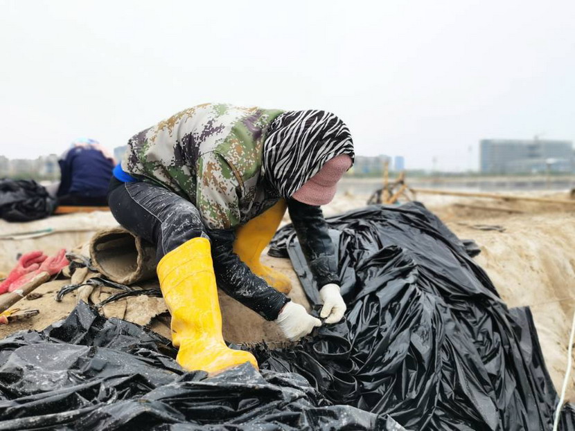 1點(diǎn)10分,在裁判員的鳴哨聲后,各參賽小組立即投入到激烈的比賽中,參賽選手們紛紛拿出自己的看家本領(lǐng),一展身手,可謂真刀真槍拼水平,都立志要在比賽中亮出平時(shí)苦練的絕活,充分展示自己的技藝。各小組成員分工有序,塑布上浮板、壓板條碼放、壓板條釘釘子、塑布上墻固定各環(huán)節(jié)無(wú)縫銜接,女工則負(fù)責(zé)將塑布上環(huán),確保塑布拉放的牢固性??粗鴧①愡x手們嫻熟的手法、精湛的技藝、配合的默契,礦鹽生產(chǎn)技術(shù)顧問(wèn)王緒前作出了高度評(píng)價(jià),他說(shuō):“我們臺(tái)北的鹽業(yè)生產(chǎn)者,技術(shù)功底扎實(shí),心理素質(zhì)沉穩(wěn),不愧是千年淮鹽的傳承者,實(shí)在令人欽佩!”