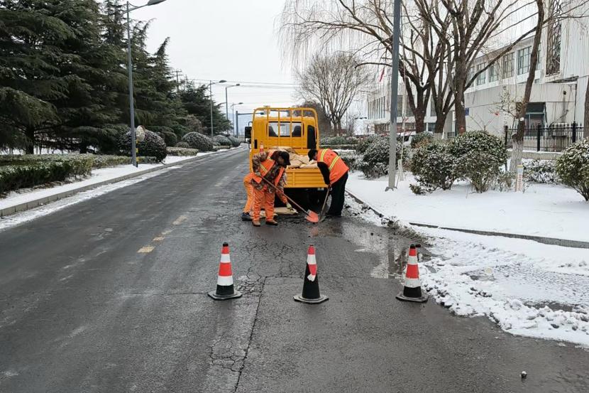 在排患工作中,盛達市政分公司安排2個“道路應急搶修小組”分頭行動,按照巡查組發(fā)現(xiàn)的情況,逐點對雪后道路坑窩等病害迅速展開搶修。考慮冬季氣溫低,不適合傳統(tǒng)熱瀝青修補方式,該公司為盡快解決安全通行問題,決定使用修補王、冷瀝青墊平等應急措施,先對道路坑窩、裂痕等進行臨時性維修,該公司在臨時修補完成后,還對維修點位建立了養(yǎng)護維修臺賬,以便事后巡查及養(yǎng)護,防止點位出現(xiàn)二次病害情況發(fā)生。