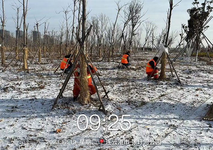 同時(shí),各班組還對(duì)新植樹木、不耐寒樹木進(jìn)行草繩裹干,確保樹木安全越冬。在樹木刷白裹干前刮去樹皮上的粗翹皮和苔蘚等寄生物,清理樹皮縫,堵塞老樹洞,進(jìn)一步提高園林樹木冬季防寒工作質(zhì)量。