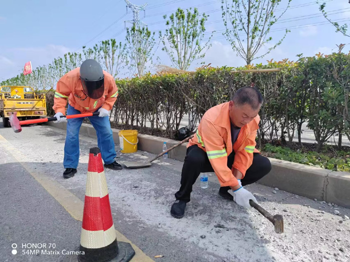 228省道西側,班長姚功巡查時發(fā)現(xiàn),有近50多米長混凝土攪伴物拋灑主干道路面,如不及時處理,嚴重影響路面行車安全。班長姚功及時召集隊員,馬不停蹄趕赴道路現(xiàn)場。上午10時左右,室外氣溫已經(jīng)直逼35℃,大家顧不上天氣的炎熱,揮動手中鐵錘,不停地震動路面“凍結”已久的水泥,黨員胡可貴與同事徐育軍、伏彩林主動參戰(zhàn),交替使用手中的撬棍,盡管汗水浸透橙色衣衫,雙手磨出了血泡,大家也沒有叫苦叫累,經(jīng)過近三個多小的努力奮戰(zhàn),終于恢復原有黑色柏油路面。