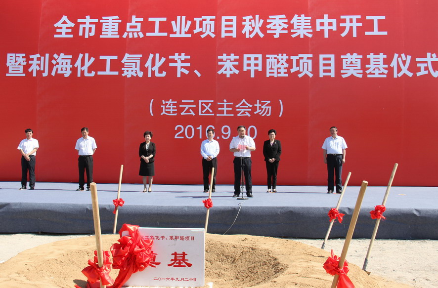 9月20日,我市重點(diǎn)工業(yè)項(xiàng)目秋季集中開工(連云區(qū)主會(huì)場(chǎng))暨利?;ぢ然S、苯甲醛項(xiàng)目奠基儀式在利海公司舉行,市委書記、市人大常委會(huì)主任楊省世,市領(lǐng)導(dǎo)楊莉、董恕娟、徐家保、魯林,集團(tuán)公司董事長(zhǎng)、黨委書記楊龍、總經(jīng)理胡建明等出席開工儀式。