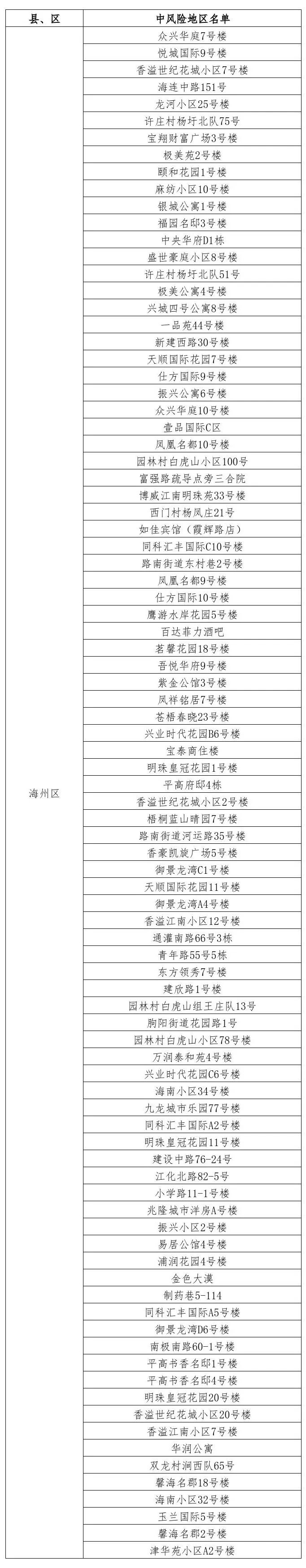 據(jù)國務(wù)院聯(lián)防聯(lián)控機制有關(guān)規(guī)定,經(jīng)市指揮部研究決定,自發(fā)布之日起,對我市部分區(qū)域疫情風(fēng)險等級進行調(diào)整:開發(fā)區(qū)久和國際新城二期33號樓由中風(fēng)險地區(qū)調(diào)整為低風(fēng)險地區(qū)。其他地區(qū)風(fēng)險等級不變。調(diào)整后全市現(xiàn)有90個中風(fēng)險地區(qū)。連云港市突發(fā)新冠肺炎疫情應(yīng)急處置指揮部辦公室2022年3月24日 連云港市中風(fēng)險地區(qū)(90個) (2022年3月24日) 據(jù)國務(wù)院聯(lián)防聯(lián)控機制有關(guān)規(guī)定,經(jīng)市指揮部研究決定,自發(fā)布之日起,對我市部分區(qū)域疫情風(fēng)險等級進行調(diào)整:開發(fā)區(qū)久和國際新城二期33號樓由中風(fēng)險地區(qū)調(diào)整為低風(fēng)險地區(qū)。其他地區(qū)風(fēng)險等級不變。調(diào)整后全市現(xiàn)有90個中風(fēng)險地區(qū)。連云港市突發(fā)新冠肺炎疫情應(yīng)急處置指揮部辦公室2022年3月24日 連云港市中風(fēng)險地區(qū)(90個) (2022年3月24日)