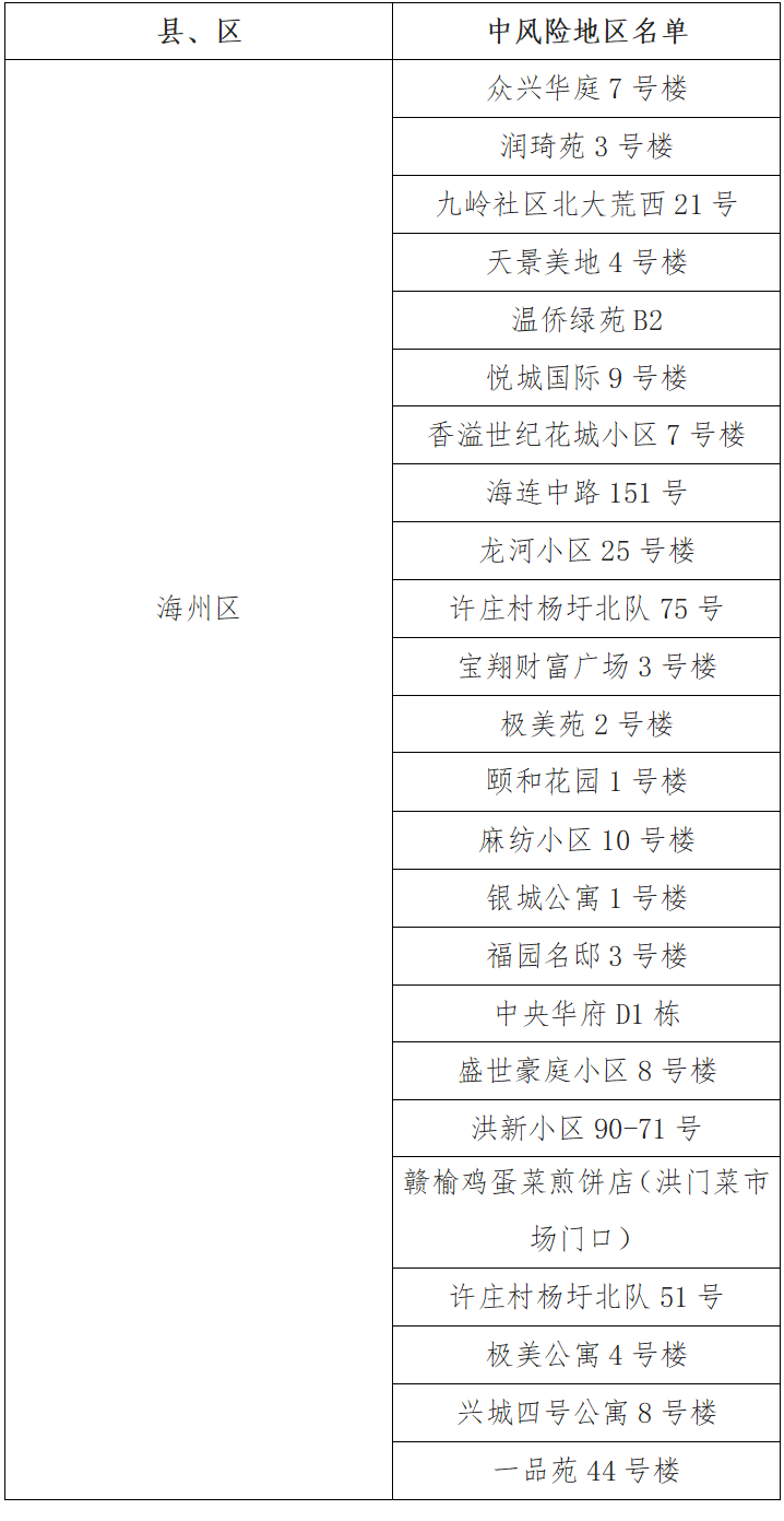 根據(jù)國(guó)務(wù)院聯(lián)防聯(lián)控機(jī)制有關(guān)規(guī)定,經(jīng)綜合評(píng)估研判,市指揮部決定,自發(fā)布之日起,將頤和花園1號(hào)樓、麻紡小區(qū)10號(hào)樓、銀城公寓1號(hào)樓、福園名邸3號(hào)樓、中央華府D1棟、盛世豪庭小區(qū)8號(hào)樓、洪新小區(qū)90-71號(hào)、贛榆雞蛋菜煎餅店(洪門(mén)菜市場(chǎng)門(mén)口)、許莊村楊圩北隊(duì)51號(hào)、極美公寓4號(hào)樓、興城四號(hào)公寓8號(hào)樓、一品苑44號(hào)樓調(diào)整為中風(fēng)險(xiǎn)地區(qū)。其他地區(qū)風(fēng)險(xiǎn)等級(jí)不變。調(diào)整后全市現(xiàn)有24個(gè)中風(fēng)險(xiǎn)地區(qū)。